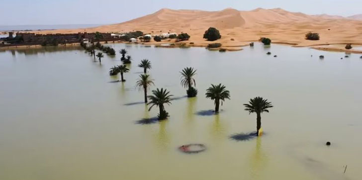 Algunas de las imágenes más notables son las de la ciudad desértica de Merzouga, donde el raro diluvio excavó nuevos lagos en las dunas de arena.