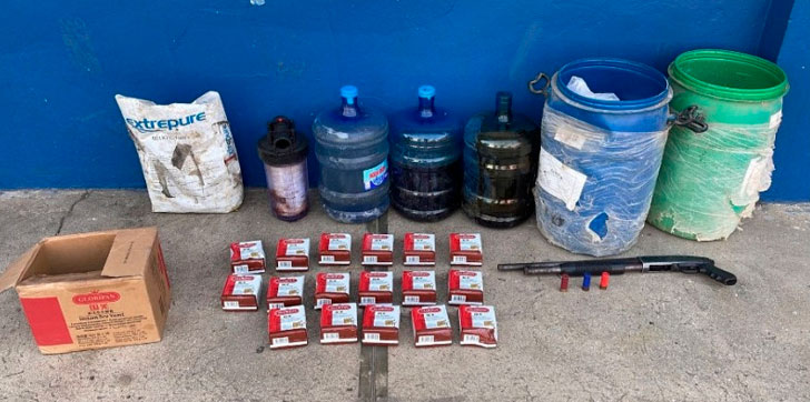 De igual modo, una caja de cartón con 17 unidades de levadura, un filtro plástico utilizado para filtrar alcohol adulterado, un botellón de cinco litros con un líquido presumiblemente alcohol adulterado, dos botellones de presunta melaza y una funda plástica llena de carbón molido.