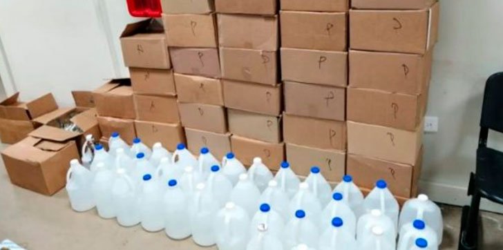 De igual manera, confiscaron 3,864 botellas, con etiquetas de distintas marcas de bebidas alcohólicas, listas para llenarlas con la sustancia adulterada.