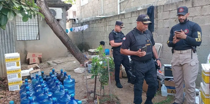 También, fueron destruidos tres tanques plásticos con más de 140 galones de alcohol preparados para luego embotellarse, 63 garrafones con alcohol, 2,000 botellas que estaban vacías y etiquetadas, 5,403 tapas para botella, 4,300 etiquetas de control fiscal, así como también rollos con cintas adhesivas alegóricas a una empresa de producción nacional y 152,000 pesos dominicanos, tarjetas bancarias, un verifone y teléfonos celulares.