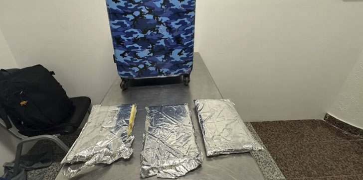 Al abrir la maleta se descubrió un doble fondo donde se ocuparon tres láminas presumiblemente cocaína envueltas en papel lumínico, con un peso aproximado a los 2.3 kilogramos.