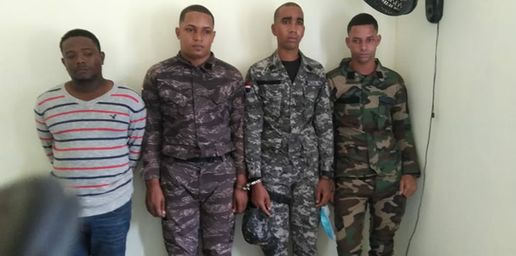 Los detenidos en el puesto de chequeo militar “Los Alejos”, de las Matas de Farfán, fueron identificados como el sargento FFAA, Antony Javier Sánchez Lorenzo y los rasos de la Policía Nacional, Jorge Luis Medina y Jefree Favier Gonzalez Reyes. También figura el civil Kenian Díaz Valdés.