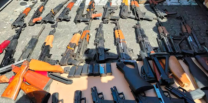 Dentro del hallazgo se encontraron 30 fusiles de distintos calibres, 6 pistolas Glock, modelo Gen 5, calibre 9 milímetros y una pistola Smith & Wesson, modelo SD9 VE, calibre 9 milímetros, además de 37 cargadores para fusiles.