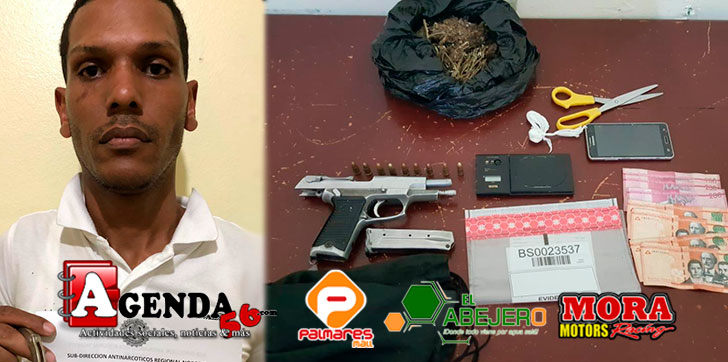 El detenido es el nombrado Roquelvin Mateo de 34 años de edad, a quien le fue ocupado la cantidad de 353.3 gramos de marihuana, 3.8 gramos de crack, una pistola marca Ruger, calibre 9mm. con numeración limitada, una balanza, una tijera, dinero en efectivo y un celular.