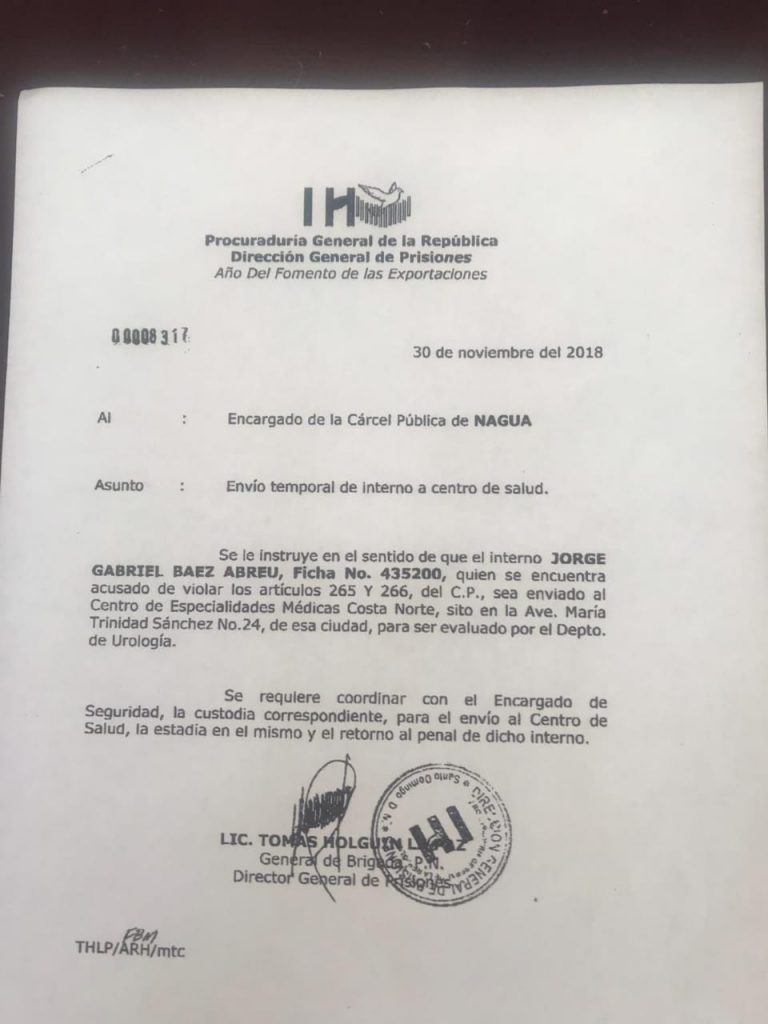 Mediante un comunicado firmado por el Director General de Prisiones, Tomás Holguín La Paz, se habría autorizado el traslado a un centro clínico del prisionero Jorge Gabriel Baéz Abreu, quien escapó con la ayuda de varios hombres armados.