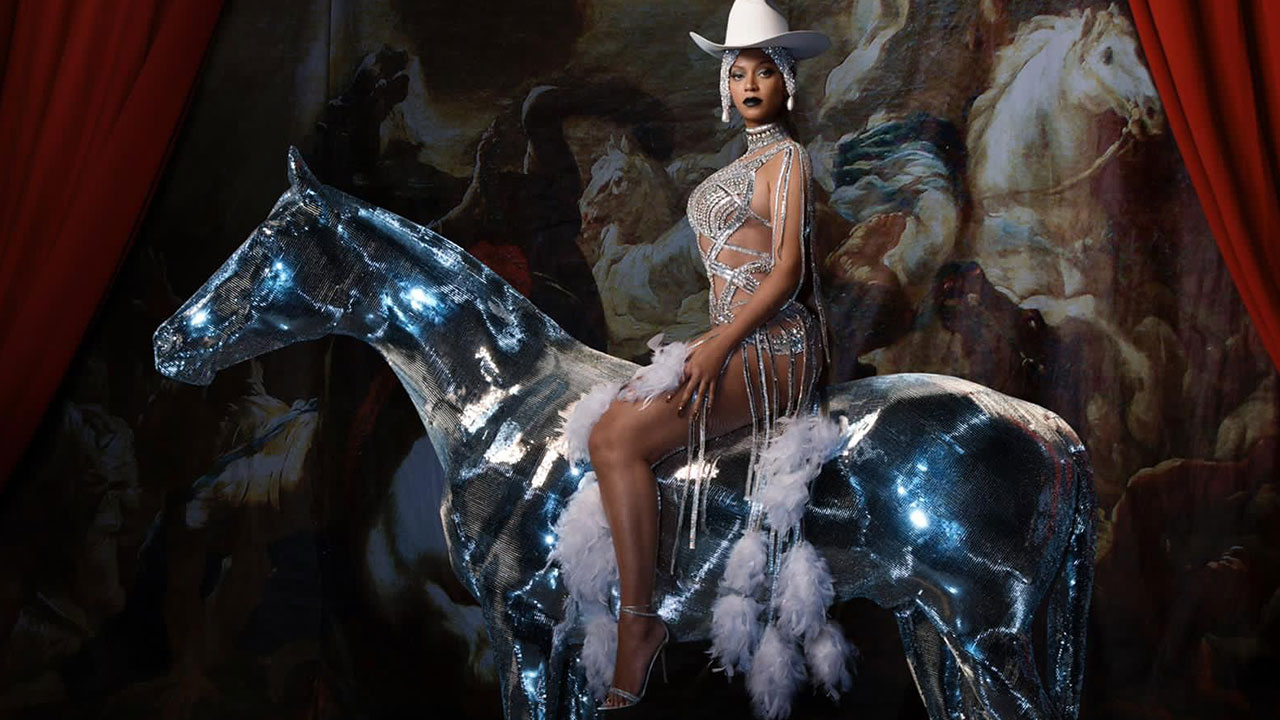 En la portada se ve a la artista estadounidense posar sentada en un caballo con un sexy vestido de plateado y un sombrero.