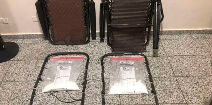 De inmediato y en presencia de un fiscal, procedieron abrir la caja encontrando dentro dos sillas playeras, cuyos tubos estaban rellenos de cocaína.