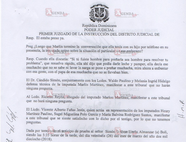 En dicha audiencia, Ureña afirmó que Marlin Martínez, instó a su hijo Marlon Martínez a que «si tú fuiste hombre para preñarla, sea hombre para resolver tu problema. Que resuelva rápido», esto con respecto al embarazo de la menor de 16 años, quien al momento de su muerte contaba con cinco meses de gestación.