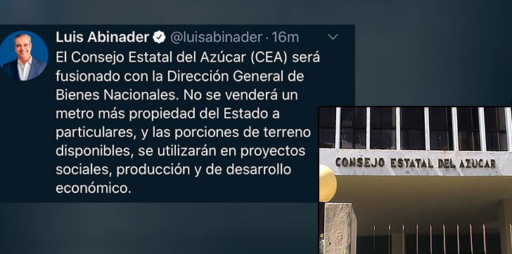 “El Consejo Estatal del Azúcar (CEA) será fusionado con la Dirección General de Bienes Nacionales. No se venderá un metro más propiedad del Estado a particulares, y las porciones de terreno disponibles, se utilizarán en proyectos sociales, producción y de desarrollo económico”, escribió el mandatario electo.