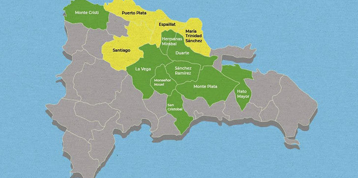 En alerta amarilla se encuentran Espaillat, María Trinidad Sánchez, Puerto Plata y Santiago, mientras que en verde están Montecristi, Duarte, Hermanas Mirabal, Sánchez Ramírez, Monte Plata, Monseñor Nouel, La Vega, San Cristóbal y Hato Mayor, según un boletín del Centro de Operaciones de Emergencias (COE).
