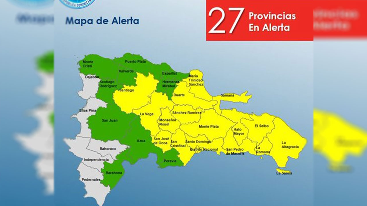 En alerta verde : Barahona, Santiago Rodríguez, Monte Cristi, Hermanas Mirabal, Espaillat, Peravia, Azua, San Juan, Valverde y Puerto Plata.