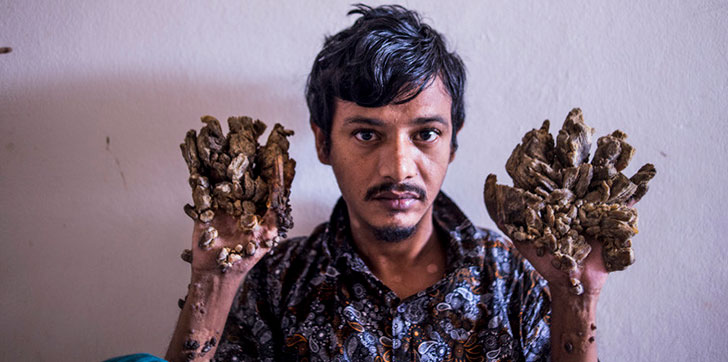 El bangladesí, apodado el ‘hombre árbol’ por sus extrañas verrugas en las manos y pies, padece de epidermodisplasia verruciforme, una enfermedad genética muy rara.