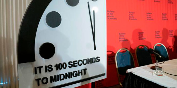 El Boletín de Científicos Atómicos ha adelantado 20 segundos el Reloj del Apocalipsis, que simboliza el fin de la civilización. La última vez que se adelantó el reloj fue en 2018, cuando el mundo se quedó a dos minutos para la medianoche en medio del avance del cambio climático, las amenazas nucleares y guerra cibernética.