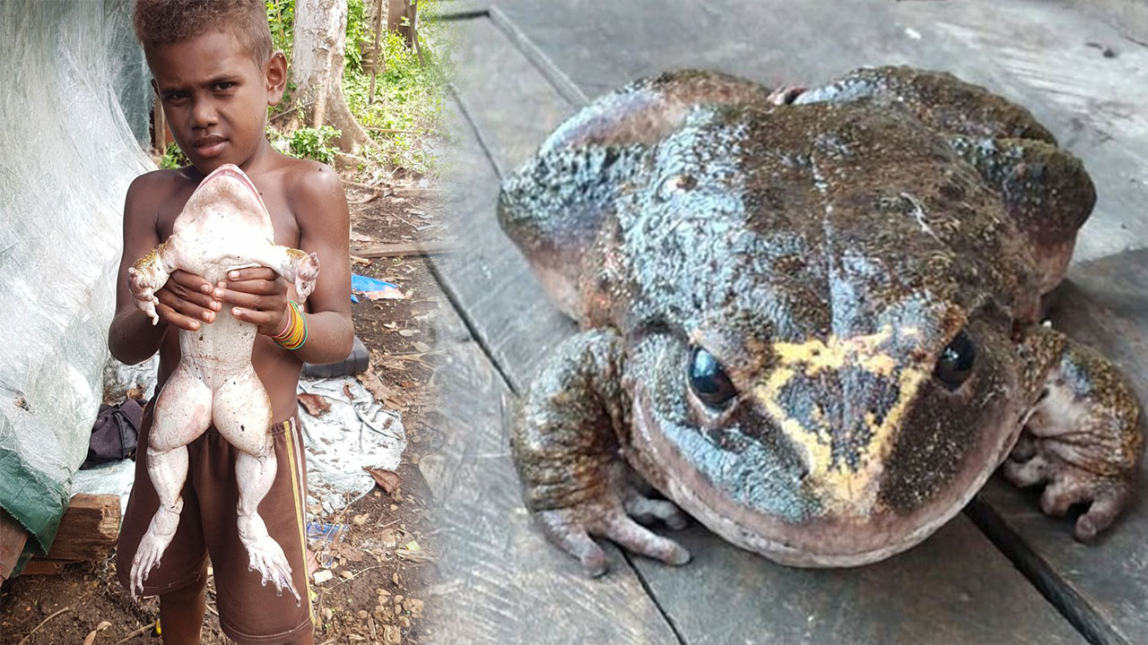 ISLAS SALOMÓN.- Una foto de un niño sosteniendo una rana del tamaño de un bebé humano ha dejado atónitos a los usuarios de las redes sociales y ha despertado un nuevo interés en una especie en peligro de extinción.