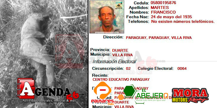 Francisco Marte, de 83 años de edad, residía en la comunidad La Paraguay y lo encontraron muerto en una loma del distrito municipal de Barraquito, en el municipio de Villa Riva. El mismo padecía el mal de alzheimer, señalaron su familiares cuando lo reportaron extraviado.