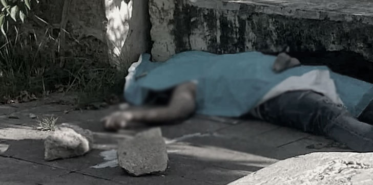 Vestía pantalones jeans azules, una camiseta blanca y medias negras. Su cuerpo yacía boca arriba en el pavimento.