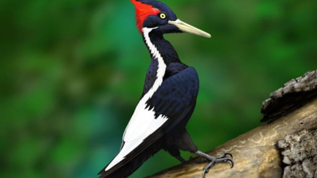 El pájaro carpintero de marfil, perteneciente a la familia Picidae, tenía el plumaje blanco y negro, con una cresta roja en los machos, y medía unos 50 centímetros. Fue clasificada como especie en peligro en 1967, principalmente por la desaparición de los bosques que constituían su hábitat y por las capturas desmedidas para coleccionistas. La última vez que fue visto un ejemplar de esta especie fue en abril de 1944 en el noreste de Luisiana.