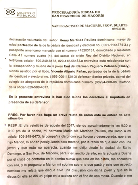 A continuación le presentamos las imágenes del interrogatorio completo, en el que Martínez explica porqué no decidió llamar a la policía una vez que se enteró del suceso y donde confiesa que cuando abandonó el país, los restos de Emely Peguero Polanco ya habían sido encontrado por las autoridades.
