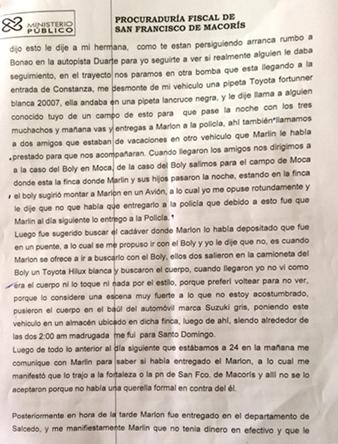 Martínez incia el relato, manifestando que entre las 8:30 p.m y 9:00 de la noche del 23 de agosto del año pasado recibió una llamada de su hermana Marlin Martínez, donde «con voz llorosa y desesperada» le comunicó que su hijo, Marlon Martínez es perseguido porque lo quieren matar, tras haber salido con una joven (Emely Peguero Polanco) y ésta no apareciera.