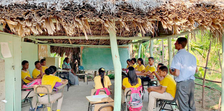 PUERTO PLATA.- Los estudiantes del liceo Tv Centro de la sección Cambiaso en el municipio de Luperón, en la provincia de Puerto Plata, llevan 18 años recibiendo clases en una vieja enramada techada de cana, debido a la tardanza en construcción de un nuevo centro. El local remendado con algunos palos y madera se encuentra prácticamente llenos de carcoma.