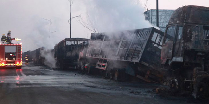 Otras 22 personas resultaron heridas y el fuego destruyó 38 camiones así como 12 automóviles, dijo el gobierno de la ciudad de Zhangjiakou en el comunicado.