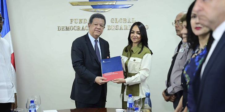 El presidente del partido Fuerza del Pueblo y expresidente de la República, Leonel Fernández, recibió de manos de la ministra de Interior y Policía, Faride Raful, el anteproyecto de Ley Orgánica de la Policía Nacional.