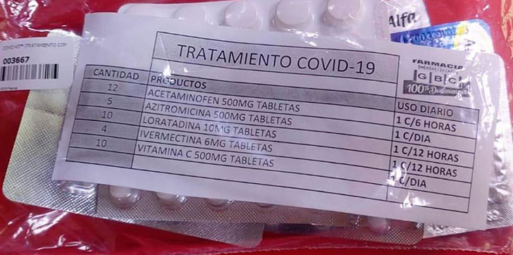 Las imágenes enviadas a este medio muestran el kit de uno de los establecimientos comerciales, conteniendo acetaminofén, ivermectina, azitromicina, loratadina y vitamina C, que con una supuesta indicación, venden por un precio de 600 pesos.