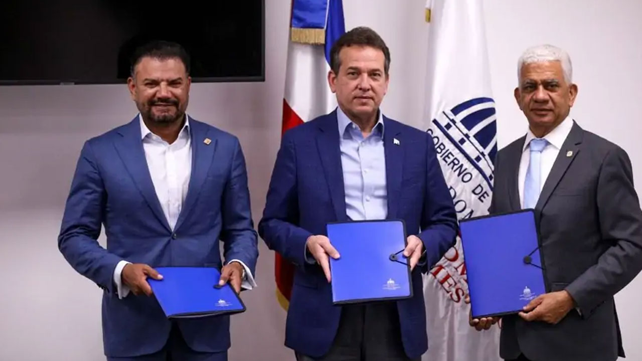 Junto al ministro Bisonó, rubricaron el acuerdo Andrés Vander Horst Álvarez, gerente general de la Fiduciaria Reservas, y Ricardo de los Santos Polanco, presidente de FENATRADO.