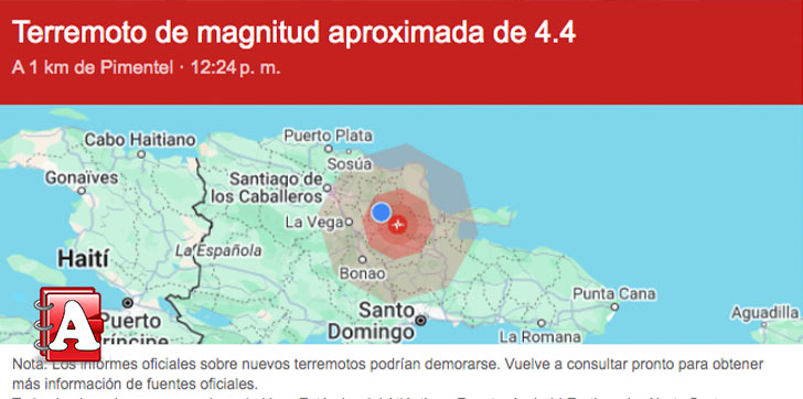 DUARTE.- Un temblor de 4.4 se registró a las 12:24 minutos del mediodía de este lunes con epicentro a 1 kilómetros al este de Pimentel en la provincia Duarte, al nordeste de República Dominicana.
