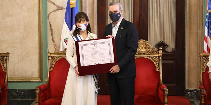 Mediante decreto, la diplomática recibió la Orden del Mérito a Duarte, Sánchez y Mella, en el Grado Gran Cruz Placa de Plata, por sus méritos al servicio de ambas naciones.