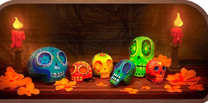 El doodle de este año incluye una serie de calaveras de dulce de colores — azul, naranja, amarilla verde — y dos velas encendidas. En el dibujo aparecen algunos pétalos de la bellísima flor de cempasúchil, que se caracteriza por su brillante color naranja amarillento.