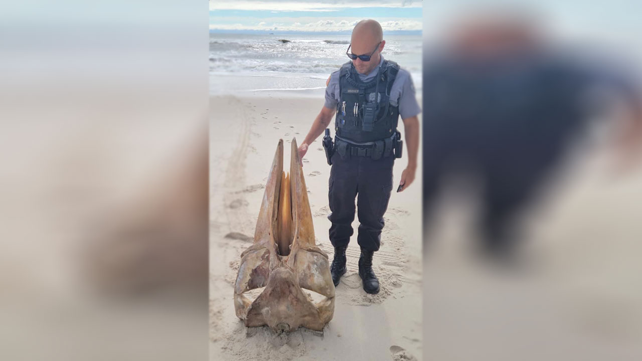 El cráneo es tan enorme que una foto publicada en la página de Facebook del Parque Estatal de Island Beach muestra que llega hasta la cintura del oficial de policía que fue visto posando con él.