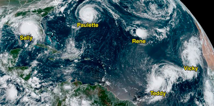 Los cinco sistemas son el huracán Paulette, huracán Sally, tormenta tropical Teddy, tormenta tropical Vicky y depresión tropical Rene.