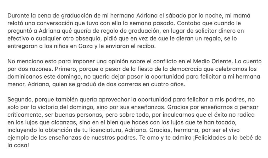 Así lo cuenta su hermana Graciela Abinader Arbaje a través de un escrito en la red social X (Twitter), en el que que aseguró no saca a la luz ese relato para poner el tema de medio oriente en el tapete, sino porque su hermana ha sido un ejemplo de la enseñanza que le han brindado sus padres.