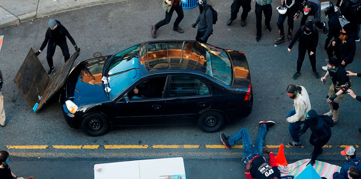 El conductor dirigió su automóvil hacia un grupo de manifestantes en el distrito de Capitol Hill de la ciudad antes de chocar contra la barricada negra y salir disparado del asiento del conductor con el arma, según el Seattle Times.