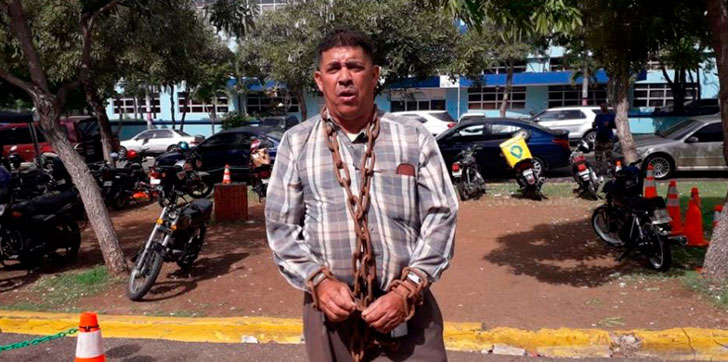 AGENDA56, SAN PEDRO DE MACORÍS.- Un hombre encadenado pidió este viernes justicia por el asesinato de su hijo en diciembre del año pasado en la cárcel de San Pedro de Macorís.