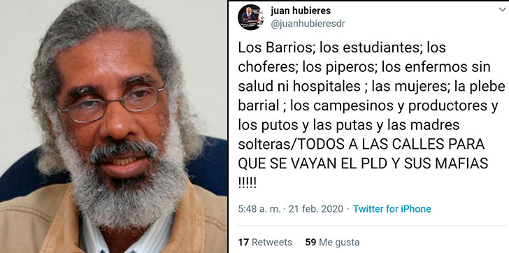 En su cuenta de Twitter en el día de Hoy Hubieres escribió: “Los Barrios; los estudiantes; los choferes; los piperos; los enfermos sin salud ni hospitales; las mujeres; la plebe barrial; los campesinos y productores; los putos y putas y las madres solteras. ¡¡¡¡TODOS A LAS CALLES PARA QUE SE VAYAN EL PLD Y SUS MAFIAS!!!!”