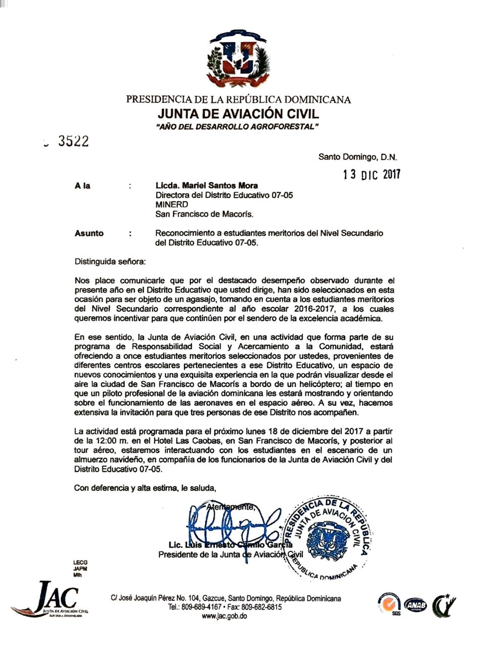 San Francisco de Macorís. –Tomando en cuenta el destacado desempeño del Distrito Educativo 07-05, bajo la direccion de Mariel Santos Mora, la Junta de Aviación Civil de la República Dominicana realizará un tour aéreo y un almuerzo navideño con los estudiantes meritorios de los centros educativos del nivel secundario, del año escolar 2016-2017.