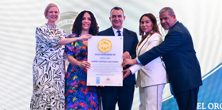 Santo Domingo.– La Junta Central Electoral (JCE) recibió el galardón en la categoría oro del «Sello Igualando RD» para el sector público, por su compromiso, esfuerzo y trabajo sostenido en promover la paridad y los derechos de las mujeres de manera interna y externa en materia electoral y de identidad ciudadana.