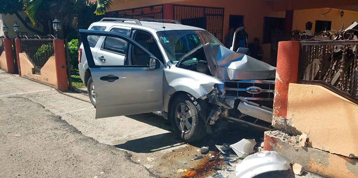 LA VEGA.- Una jeepeta impactó ayer contra la columna de una vivienda luego de que el conductor volara el reductor de velocidad y perdiera el control del vehículo mientras transitaba por la calle Gastón F. Designe de la ciudad de Jarabacoa.