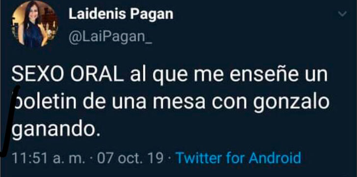 AGENDA56, SANTO DOMINGO.- La joven usuaria de las redes sociales Laidenis Pagan ofreció a través de su cuenta de Twitter darle sexo oral a quien le mostrará un boletín de alguna mesa donde el precandidato a la presidencia por el Partido de la Liberación Dominicana (PLD), Gonzalo Castillo, haya ganado.