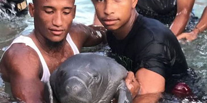 Jóvenes del municipio de La Ciénaga en la costa de Barahona atraparon en las aguas del mar Caribe a un bebé Manatí.