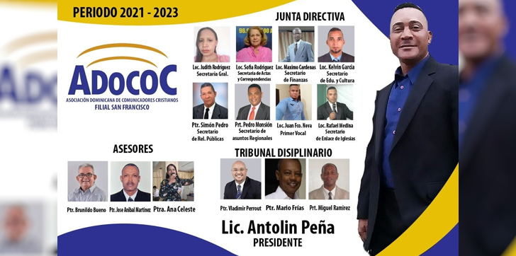 ADOCOC que llega por primera vez a San Francisco de Macorís eligió por unanimidad absoluta al Lic. Antolín Peña Luna como su presidente, Peña quien es Lic. en comunicación, miembro del Circulo de locutores de la República dominicana, además fue presidente de la Asociación de locutores de la Provincia Duarte, entre otras funciones importantes ocupada en la sociedad francomacorisana, junto a Antolín Peña completan la directiva los locutores y Ministros de la palabra de Dios: Judith Rodríguez, Sec. Gral., Sofía Rodríguez, de Actas y Corresp., Máximo Cárdenas en finanzas, Simón Pedro Hernández , Enc. de relaciones Públicas, lo mismo que Kelvin García, quien será el responsable de educación y cultura, además fueron electos el Pastor Pedro Monción enc. De asuntos Regionales, Rafael Medina enlace entre la Asociación y las Iglesias y Juan Fco. Nova es el Primer vocal.