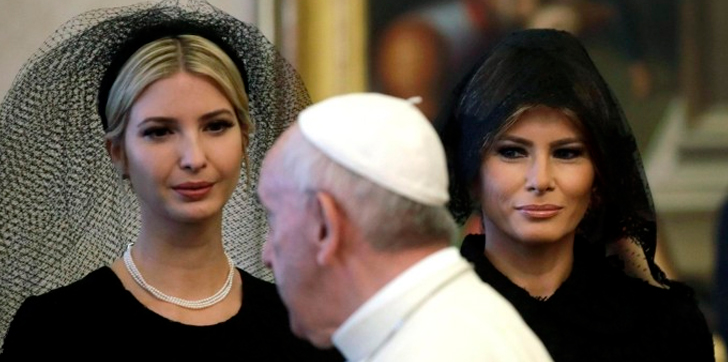 Melania Trump acudió a la audiencia papal en el Vaticano, y siguiendo el protocolo, vistió de negro, con el pelo recogido y mantilla corta de encaje, al igual que Ivanka, hija mayor y asesora del presidente, igualmente de negro y con velo de tul.