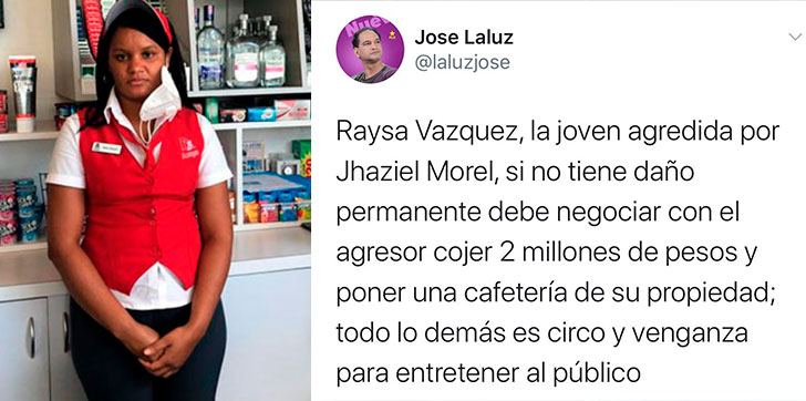 “Raysa Vázquez, la joven agredida por Jhaziel Morel, si no tiene daño permanente debe negociar con el agresor coger 2 millones de pesos y poner una cafetería de su propiedad; todo lo demás es circo y venganza para entretener al público”, indicó Laluz a través de una serie de publicaciones sobre el tema, posición que ha desatado comentarios a favor y en contra en las redes sociales.