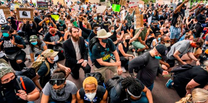 «¡No puedo respirar!», coreó un centenar de personas, que se tendieron en el suelo a la vez en la intersección entre las calles H y 16 para repetir la frase que enunció el afroamericano George Floyd la semana pasada, poco antes de morir por asfixia debido a la presión que ejercía sobre su cuello la rodilla de un policía blanco.