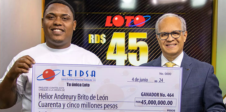 AGENDA56, SANTO DOMINGO.- La Lotería Electrónica Internacional Dominicana (Leidsa) informó, que entregó al joven Helior Andreury Brito de León, el cheque de 45 millones de pesos que tenía el sorteo Loto el pasado miércoles 8 de mayo.