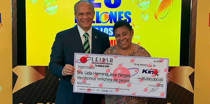 AGENDA56, SANTO DOMINGO.- La Lotería Electrónica Internacional Dominicana (Leidsa) entregó a Lidia Herminia José Berges, su premio de RD$25 millones al resultar ganadora en el sorteo del ”Súper Kino Tv”, del pasado miércoles 29 de enero del presente año.