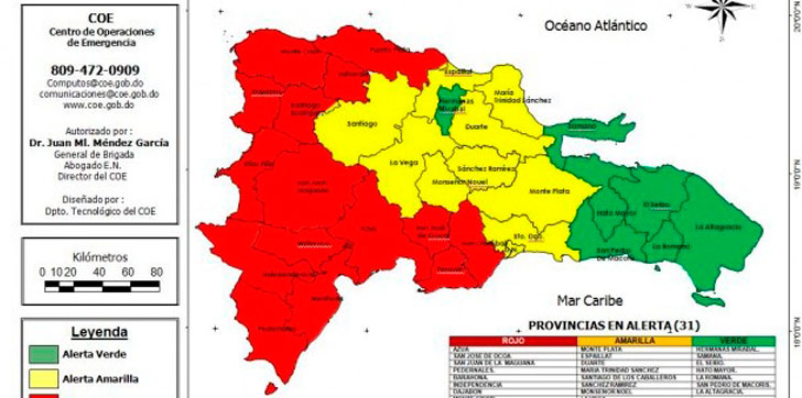 Debido a posibles inundaciones repentinas en zonas urbanas y rurales, crecidas de ríos arroyos y cañadas y deslizamientos de tierra, el COE estableció la alerta roja en 15 provincias, otras nueve en alerta amarilla y siete en nivel verde.