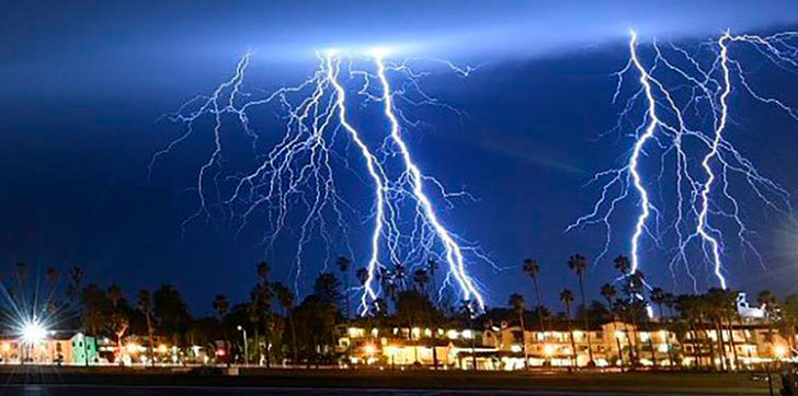 Mike Eliason, oficial de información pública de los bomberos de Santa Bárbara, capturó dramáticos relámpagos sobre Santa Bárbara. Las imágenes se asemejaban a una escena que uno vería en la Florida, que ha sido apodada la capital de los rayos en Estados Unidos.